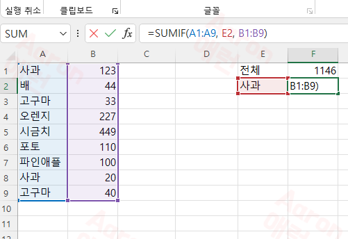 =SUMIF(A1:A9, E2, B1:B9)를 입력하면 사과값들만 더해집니다. (123+20) 결과값은 143이 나옵니다.