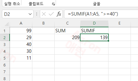 SUMIF함수는 두 번째 인자에 조건을 입력할 수 있습니다. >=40이라고 입력했기 때문에 40 이상의 숫자만 더하기를 합니다. 40 이상의 숫자는 40과 99이고 더하면 139가 나오게 됩니다.