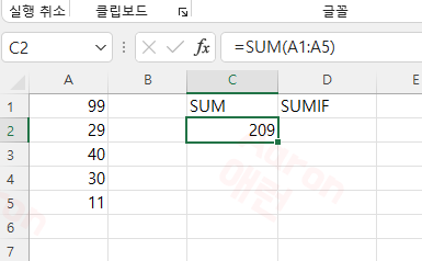 숫자 5개가 있는 데이터를 준비했습니다. =SUM(A1:A5)를 이용해서 전체 합을 구했습니다.