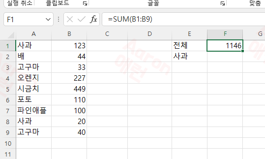 B1:B9 -> 세 번째 항목을 넣으면 실제 SUM계산이 이 범위에서 이루어집니다. “사과”와 같은 행에 있는 숫자가 더해집니다.